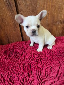 You read that correctly: only $1499 for a Frenchie!! Turns out this cream color is a bit less catchy, but you will get the same suave, playful, endearing temperament typical of Frenchies, and save several hundred dollars at the same time! She was born Feb 8, 2025, she will be ready to go on April 8, after she is vet-checked. We have two similarly-colored sisters available as of this writing. You can put a deposit
