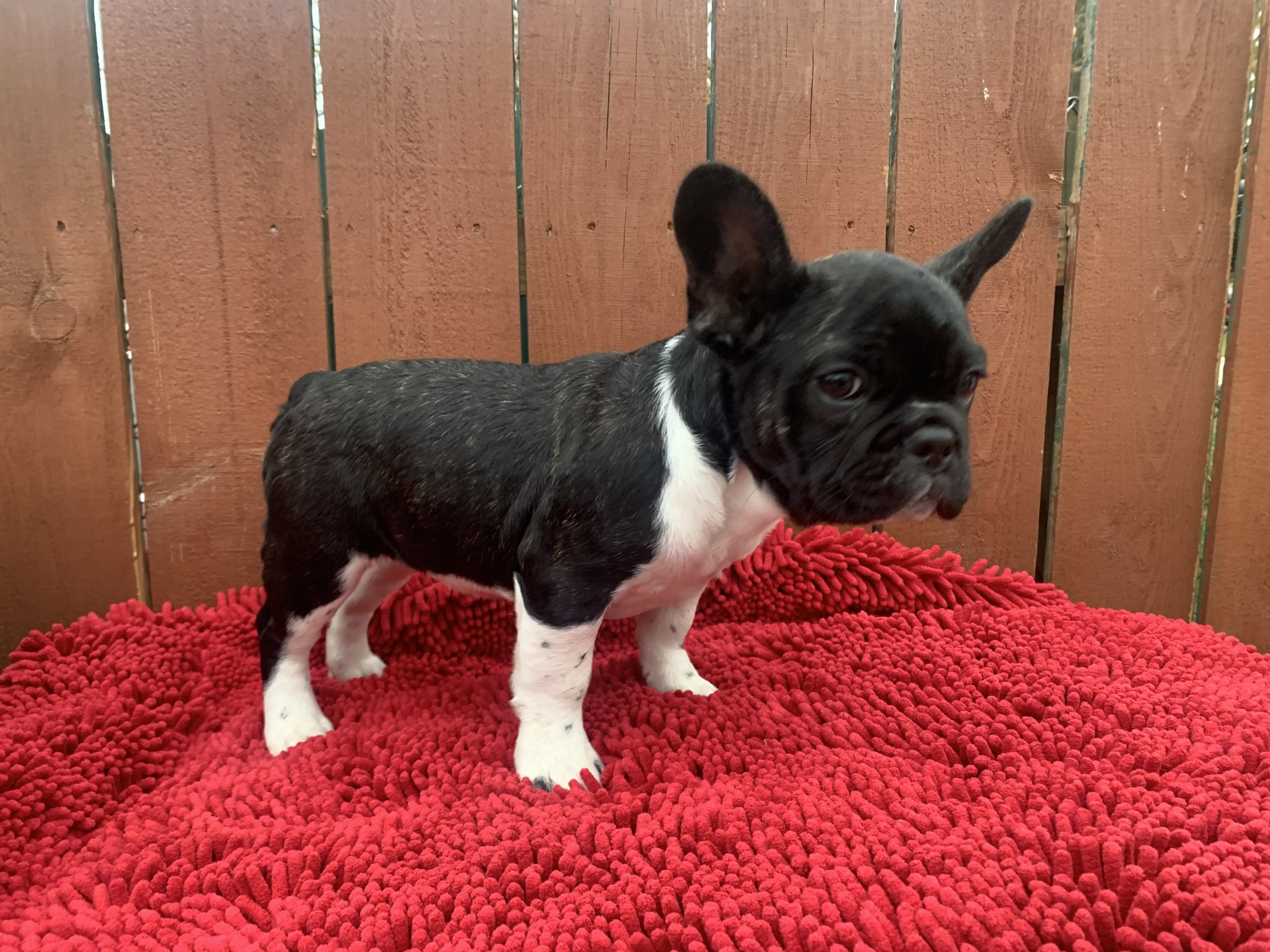 Frenchie, pictured here, is a delightful puppy who goes bonkers over anyone paying attention to her. Google “Frenchies” to learn more about them: they are indeed a unique breed. She was born 8-19-25. Now is your chance to own a great one at a great price. Come check her out!