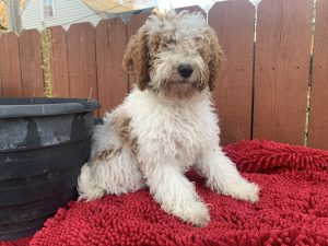 This pup was born Aug 15, 2025, and will probably end in the 20-26# range as and adult dog. This is one of the most delightful dog breeds for a good reason: not only are they loveable, happy, eternally playful, and easy to train, but they have a non-shed, hypoallergenic coat. (We plan on getting her groomed this week!).