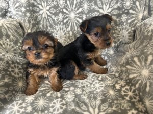 We have 2 brother Yorkie pups pictured here, born 11-29-25. The one on the left weighs 1.9#, and is $999, his brother weighs 3.1 # and is $899. We guess 8#, 11# respectively, when they are full-grown. They are UTD on vaccines, vet-checked and ready for a new home where they promise to be loving, faithful, and entertaining for a long time. Yorkies do need regular grooming to look their best. Come check them out… and come see the difference in how we take care of all of