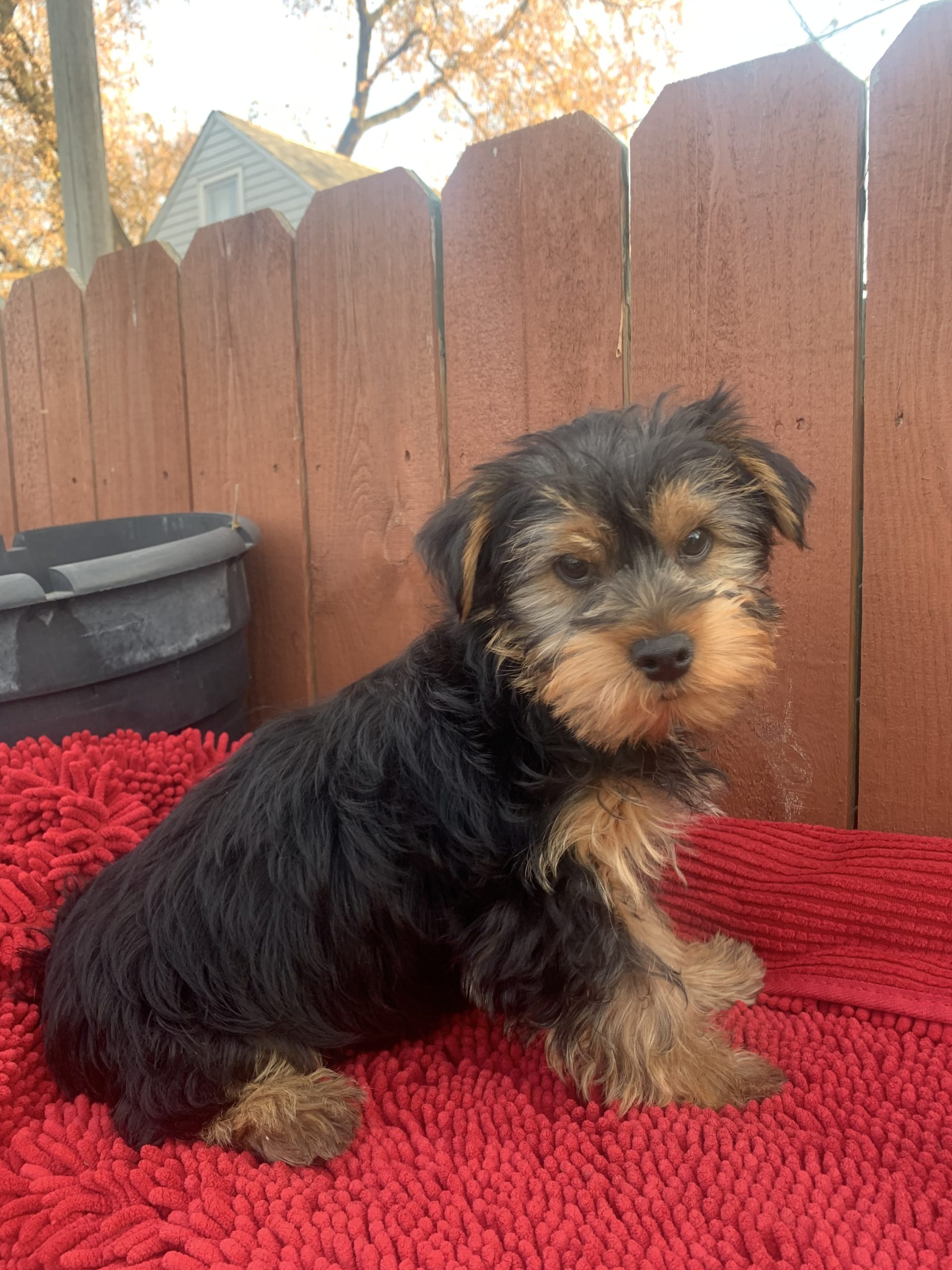 Born 8-17-25 this beautiful  pup’s mama was a 14 # mini poodle bred to a 11 # Yorkshire Terrier, and he looks like he will lend up being more like mama, as he weighed 7.8# at the vets on 11-21-25. This is one of the most popular small breeds, because it combines the cool looks of the Yorkie with the hypoallergenic coat and intelligence of the mini poodle. He is laid-back in his temperament ( come see what we mean1).